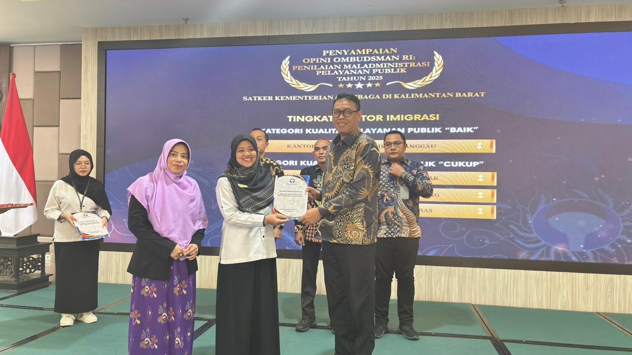 Indonesia Perwakilan Provinsi Kalimantan Barat. Piagam penghargaan predikat baik tersebut diterima langsung oleh Kepala Kantor Imigrasi Kelas II TPI Sanggau, Arung Safiro Untung di Aula Garuda Pemerintah Provinsi Kalimantan Barat, Jumat, 13 Februari 2026.